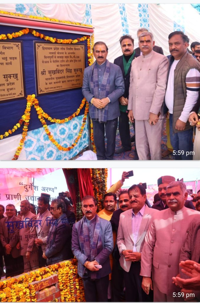 उन्होंने देहरा विस में 6.02 करोड़ रुपये की दो सड़कों नैहरन पुखर से बाड़ा वाया भरूण तथा चिंतपुरनी से बरवाड़ा के कार्य का शिलान्यास किया।इसके उपरांत मुख्यमंत्री ने नगरोटा बगवां के गांधी मैदान में नगरोटा बगवां तथा पालमपुर विधानसभा क्षेत्र के लिए 427 करोड़ रुपये की 30 विकास परियोजनाओं के उद्घाटन और शिलान्यास किए।उन्होंने राजीव गांधी राजकीय इंजीनियरिंग कॉलेज नगरोटा बगवां के 6.50 करोड़ रुपये से निर्मित पुस्तकालय तथा कंप्यूटर सेंटर का उदघाटन किया। इसके अलावा उन्होंने 3.80 करोड़ रुपये की लागत के राजकीय फार्मा कॉलेज में बने 100 बच्चों की क्षमता के छात्र छात्रावास का लोकार्पण तथा 41.47 करोड़ रुपये से बने 200 बिस्तरों के श्री जी.एस. बाली मातृ शिशु अस्पताल टांडा का उद्घाटन किया।